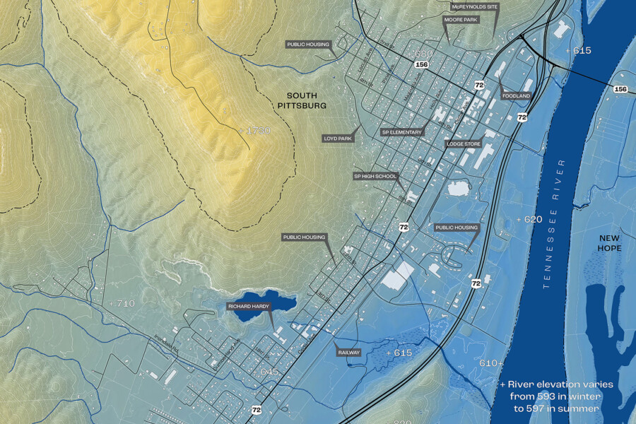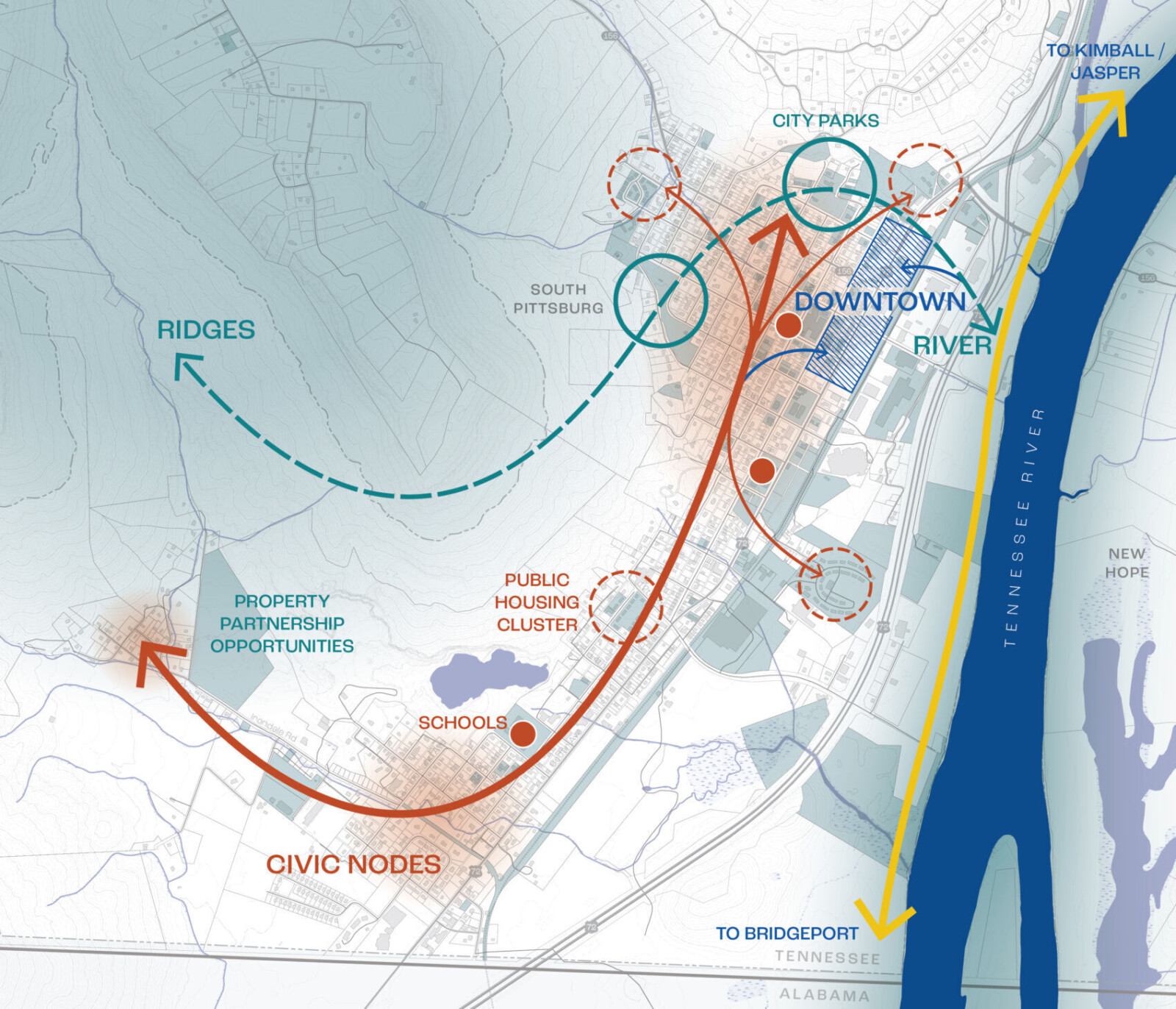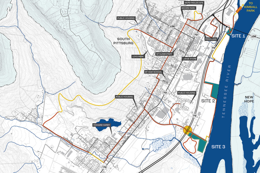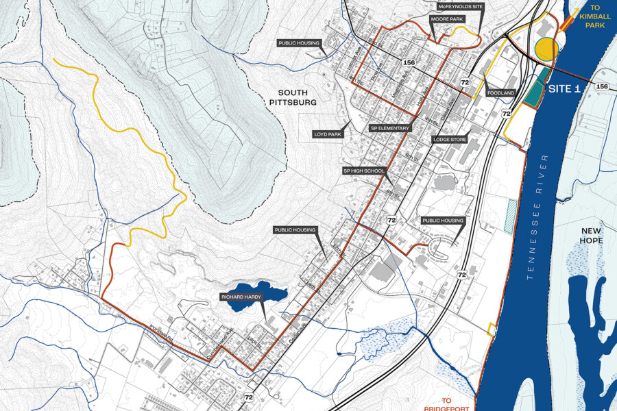 WMWA was hired to develop the CONNECT South Pittsburg Framework Plan, which envisioned a bicycle and pedestrian network and river park for the City of South Pittsburg. Although South Pittsburg technically functions as a waterfront city, many of its residents are currently separated from the Tennessee River by a major highway and an active rail corridor. The framework plan aims to relink South Pittsburg with the river by accentuating the economic, ecological, and recreational benefits that can be provided for the residents of South Pittsburg.