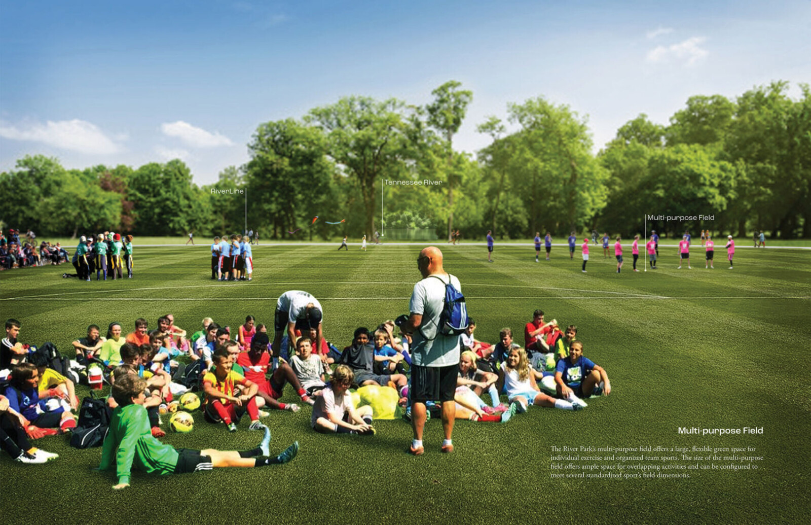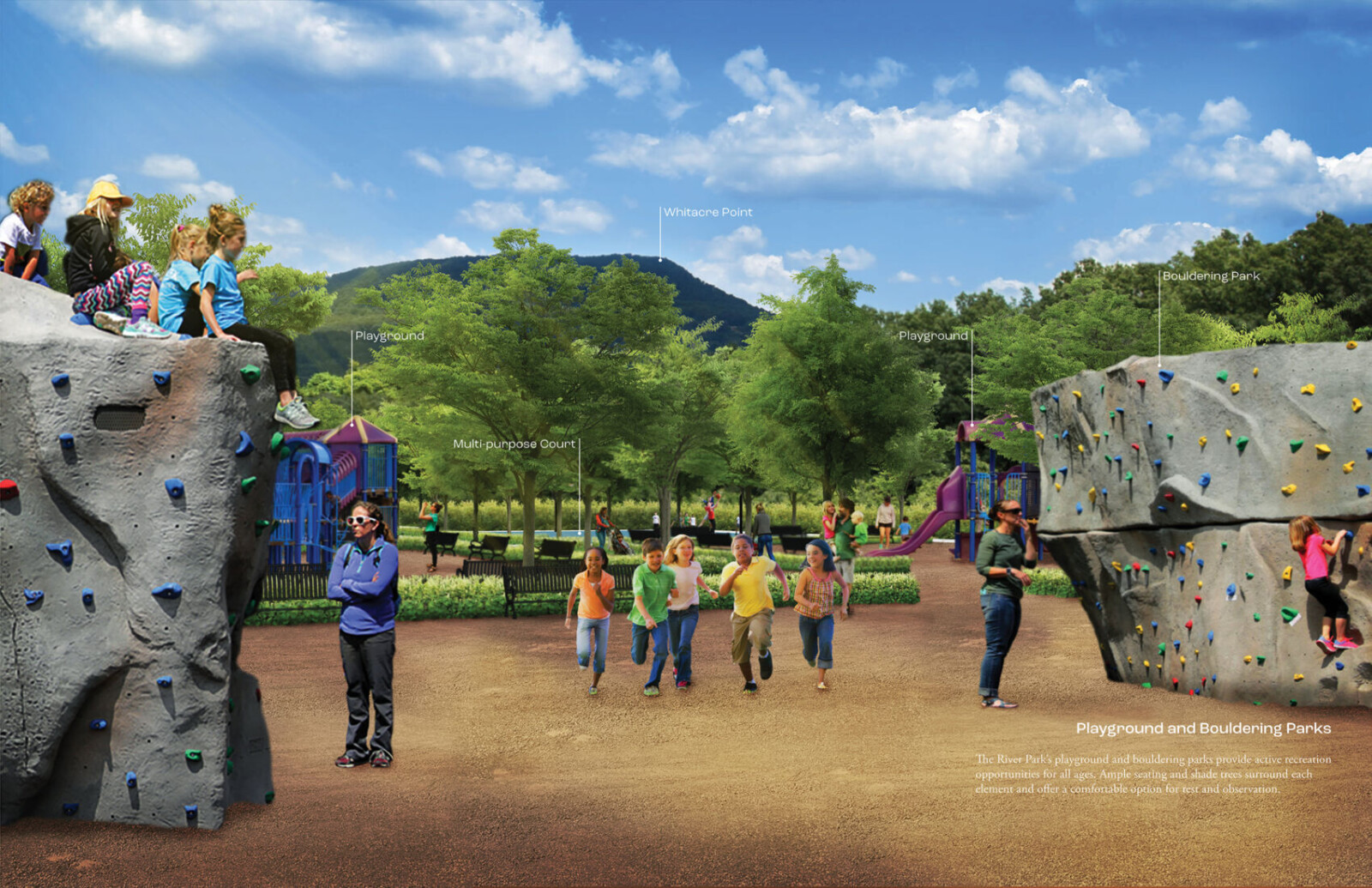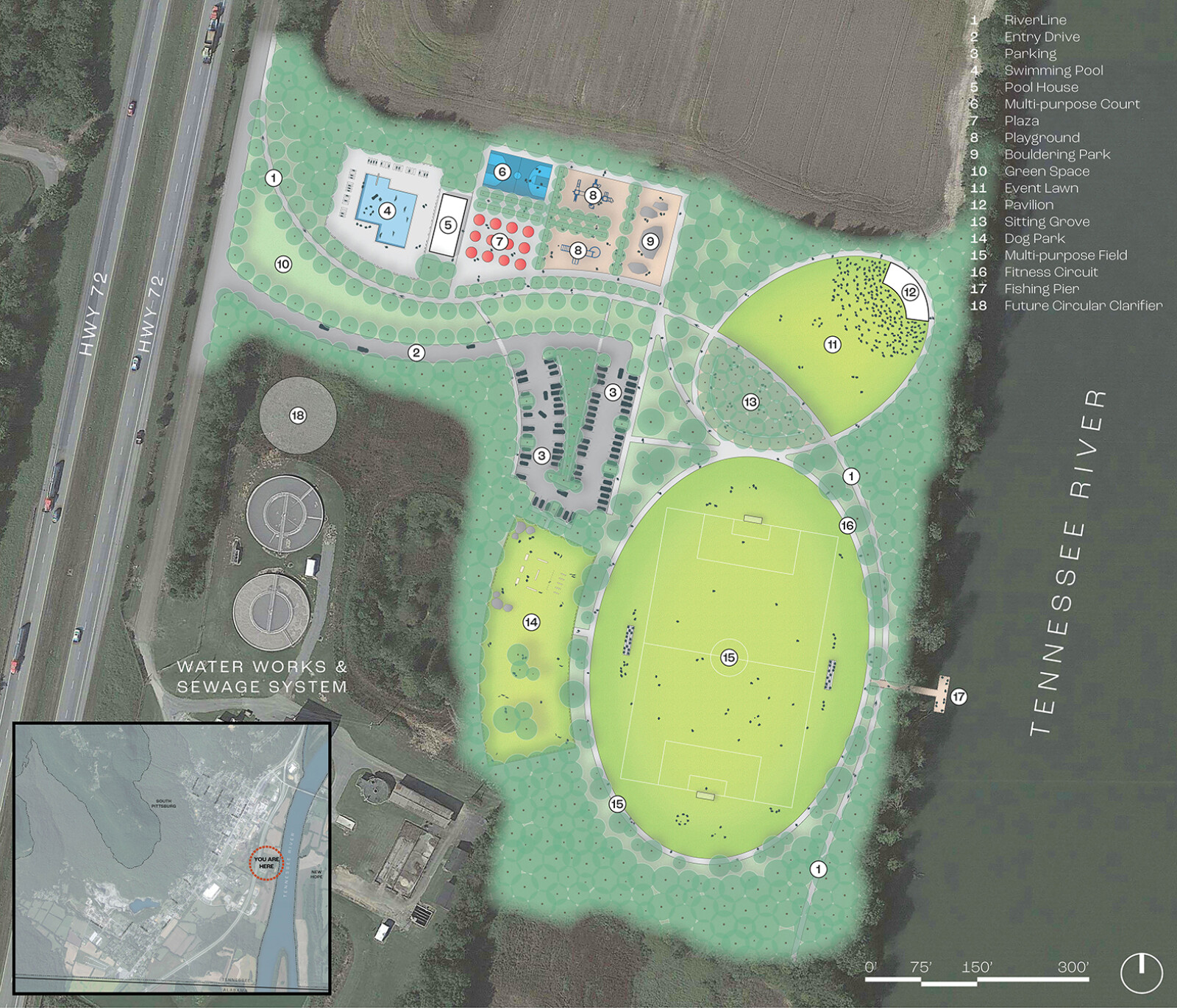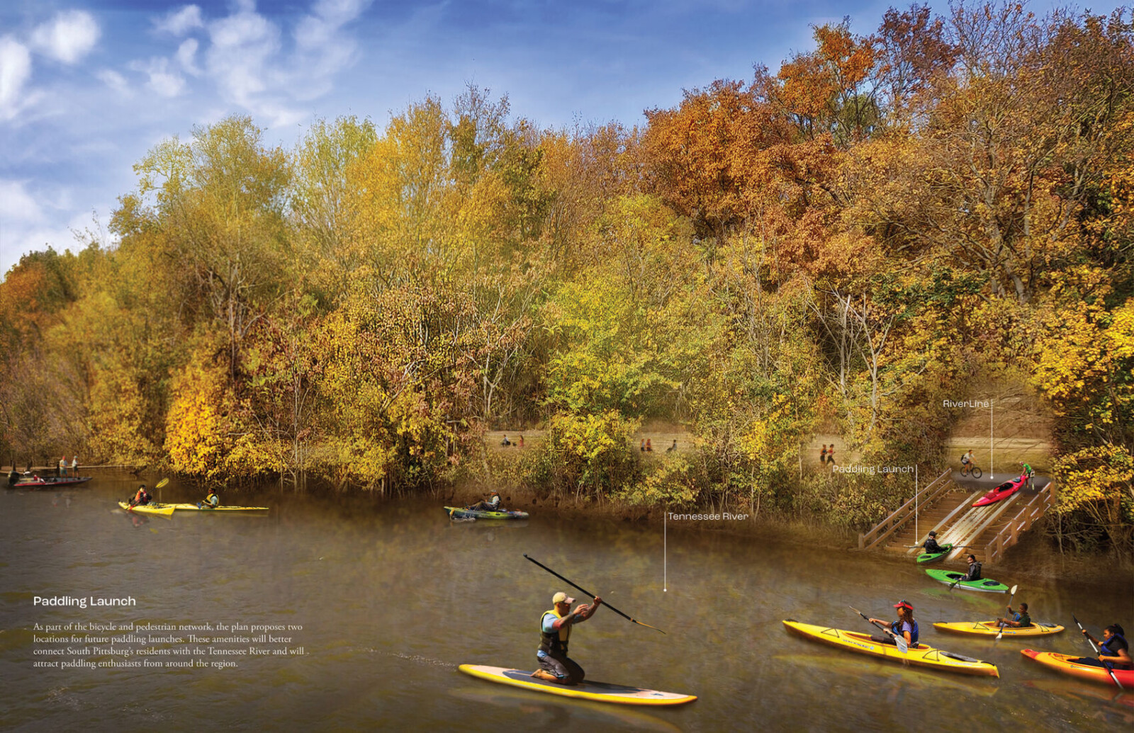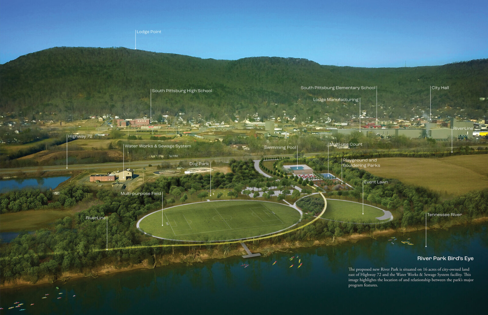 Following the engagement phase, WMWA developed conceptual designs for the bicycle and pedestrian network and the river park. The proposed bicycle and pedestrian network consists of three main typologies: the Shared Alley for urban connectivity, the RiverLine along the Tennessee River, and the Separated Shared Use Paths connecting the Shared Alley with the RiverLine. The proposed network is intended to maximize equitable circulation and destination access for South Pittsburg residents. The proposed new River Park, which is situated on 16 acres of city-owned land east of Highway 72, is loosely organized into three nodes of similar activities. The first offers a variety of activities for kids and adults and includes a swimming pool, a multi-purpose court, a plaza, two playgrounds, a bouldering park, and a passive recreation green. The second node features an event lawn, a pavilion, and a shaded grove for concerts, movies, festivals, other community events. The last node includes a dog park, a multi-purpose field, a fitness circuit, and a fishing pier. The CONNECT South Pittsburg Framework Plan was completed in 2022.