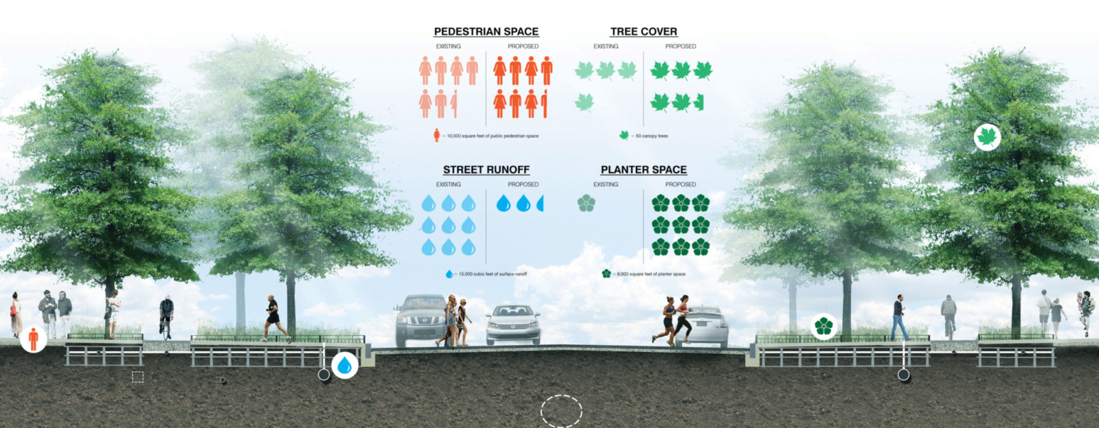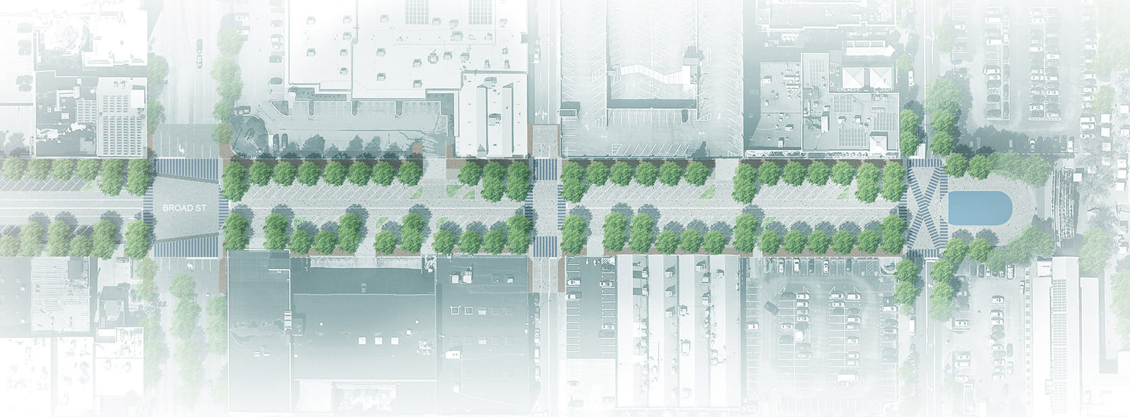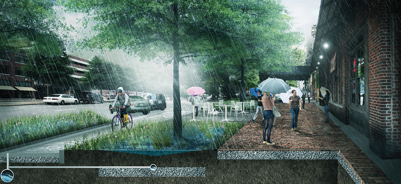 Streamline Broad Street re-imagines a new commercial district that prioritizes the pedestrian experience by enhancing the safety, sustainability, and quality of urban design in downtown Chattanooga. This study explores the possibilities of a comprehensive approach to stormwater management, transportation infrastructure, and pedestrian accessibility within the public right of way. The redistribution of parking and traffic flow optimizes car travel lanes, safeguards cyclists, and creates larger pedestrian spaces. The expansion of sidewalks features pedestrian amenities like benches, newspaper boxes, and bike parking, while offering the space for large events like street fairs and outdoor seating for adjacent restaurants. This plan distinguishes the biking and vehicular experience by providing separated travel lanes, and bikers are further protected by their placement in front of stopped traffic at intersections, which keeps them in view and provide a head start once they are signaled to proceed. Curb extensions at cross walks shorten pedestrian exposure and travel distance, while slowing traffic and reducing unnecessary vehicular paving at intersections. Framing the orientation of this design, the intersection of Broad Street and MLK Boulevard acts as the gateway to the City Center with Broad Street terminating at the Tennessee Aquarium and Tennessee River. To highlight these vital intersections, the pedestrian scramble crosswalks allow comfortable crossings while all other traffic is halted. Strengthening the plan’s commitment to integrated stormwater management, the redesigned streetscape showcases sustainability through the integration of multiple green infrastructure improvements such as uncompacted soils to support large canopy trees, porous paving, and rain gardens. Trees reduce stormwater through interception and evapotranspiration, while rain gardens and porous paving provide infiltration and distributed storage, and the resulting run-off volumes and peak flows are greatly reduced while prime urban public space is created. Streamline Broad Street serves as a prime example of an integrated approach to managing the complexity of urban systems at the pedestrian scale.
