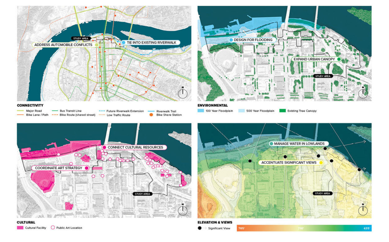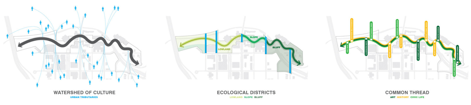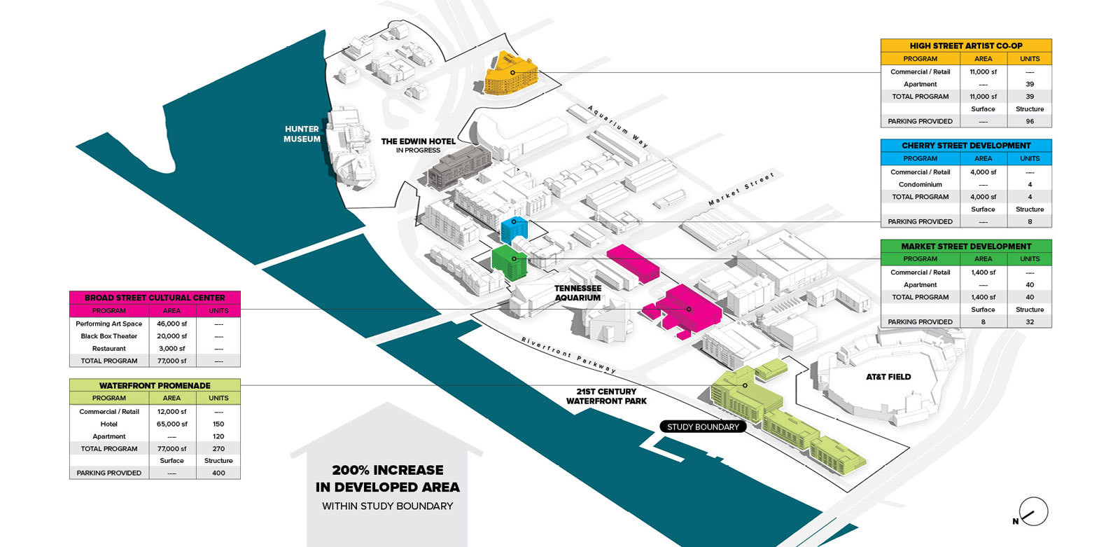 Nestled within the heart of downtown Chattanooga from the Hunter Museum to the Chattanooga Green, The Ramble is a 22-acre district master plan that weaves the ecological and cultural legacies of the city into the urban fabric of today. Initially engaged by Chattanooga’s River City Company, WMWA and our multi-discipline team of design professionals collaborated with stakeholders from the city’s riverfront district to establish a framework for an innovative and engaging urban pedestrian corridor. The focus of this process leveraged increasing public interest to advocate for a plan that proposed a network of thoughtful and attractive public spaces that could house public artwork and could provide ample space for large public gatherings. Navigating the variety of urban conditions and the architectural inconsistencies within the limit of work, the plan defined a clear set of diverse design strategies the visually unified the site into a cohesive district of coherent and connected sequence of spaces. The plan specifically addresses accommodation of diverse users and experiences, pedestrian and vehicular circulation and safety, urban infill, parking, increased tree canopy, stormwater management and improved wayfinding. The Ramble serves as an innovative solution to the changing needs of Chattanooga’s urban core, and uniting the 22-acre site through an intentional visual framework provides a new precedent for how public spaces can blend into the existing fabric of the city.