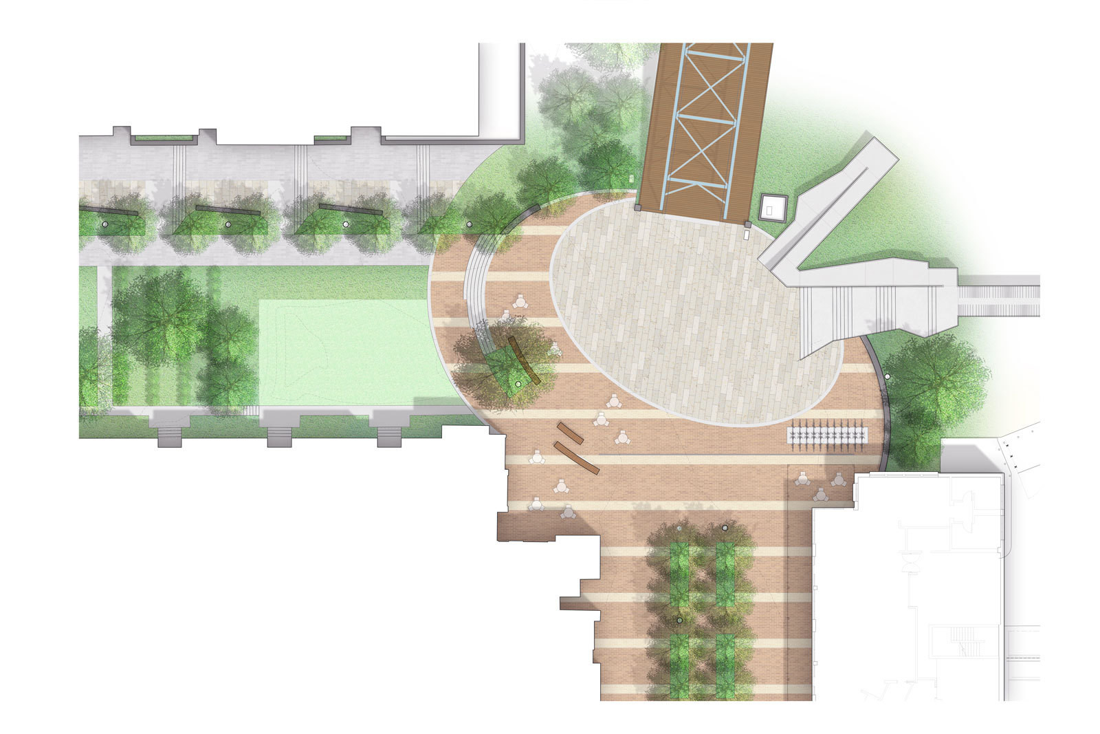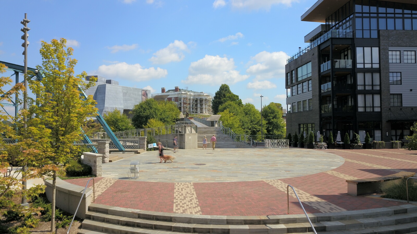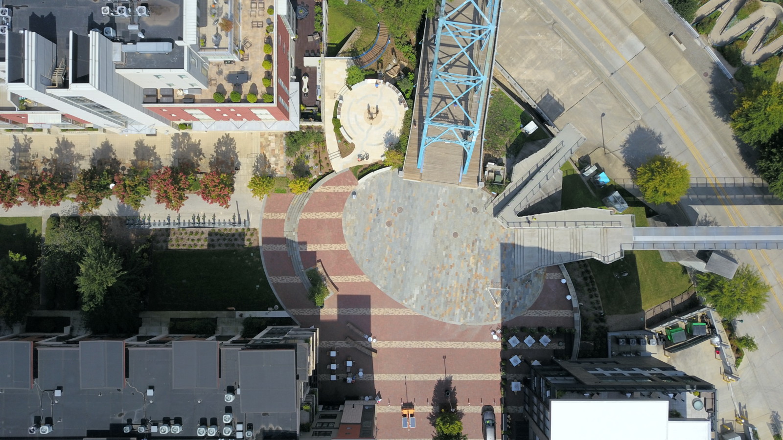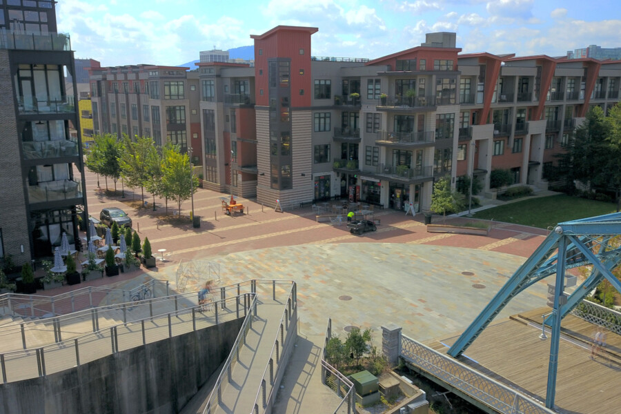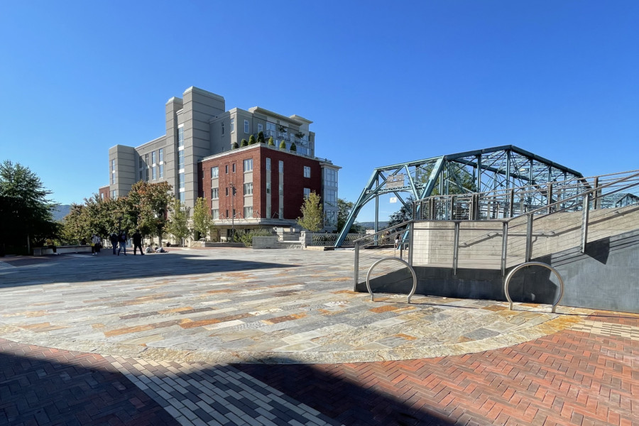 As the second built component of The Ramble master plan, Walnut Street Plaza highlights a design approach that address the challenges of reconfiguring urban spaces to be more accommodating to the pedestrian user. Located at the nexus of the Walnut Street Bridge and Holmberg Bridge landings is the most active pedestrian intersection in Chattanooga, and our design proposed a shared street and a new urban plaza that would comfortably and safely negotiate the pedestrian traffic. A large oval plaza signifies the arrival into the space and offers ample room for large, public events, while providing the necessary access for utility and emergency vehicles. Recalling the aesthetic of Chattanooga’s endemic material palette, the oval plaza incorporates Tennessee sandstone stairs, wall caps, and pavers, while custom wood and steel benches match the curves of the oval. In addition, the materials incorporated in the multi-use section of the plaza features unit pavers, curbless paving, and trees in the center of the space, which heightens driver awareness and creates a safer space for bicyclist and pedestrians. A spacious planter in the southwest corner includes a large oak and soil cells to ensure it can reach shade tree size. Phase 1 of the Walnut Street Plaza was completed in 2018, and Phase 2 was finished in July 2021.